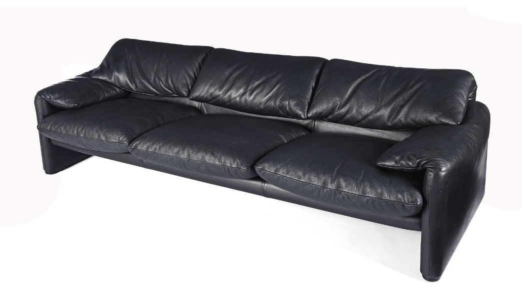 Designed for Cassina, Italy in 1973. Original black leather upholstery & adjustable headrests. Fabric label. 238 x 85 x 72/100 cm (A pair of maralunga sofas is available) The Maralunga series was the winner of the Compasso d’Oro award in 1973. -