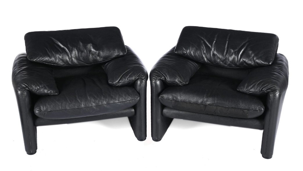 Designed for Cassina, Italy in 1973. Original black leather upholstery & adjustable headrests. Fabric label. 98 x 85 x 72/100 cm The Maralunga series was the winner of the Compasso d’Oro award in 1973. -