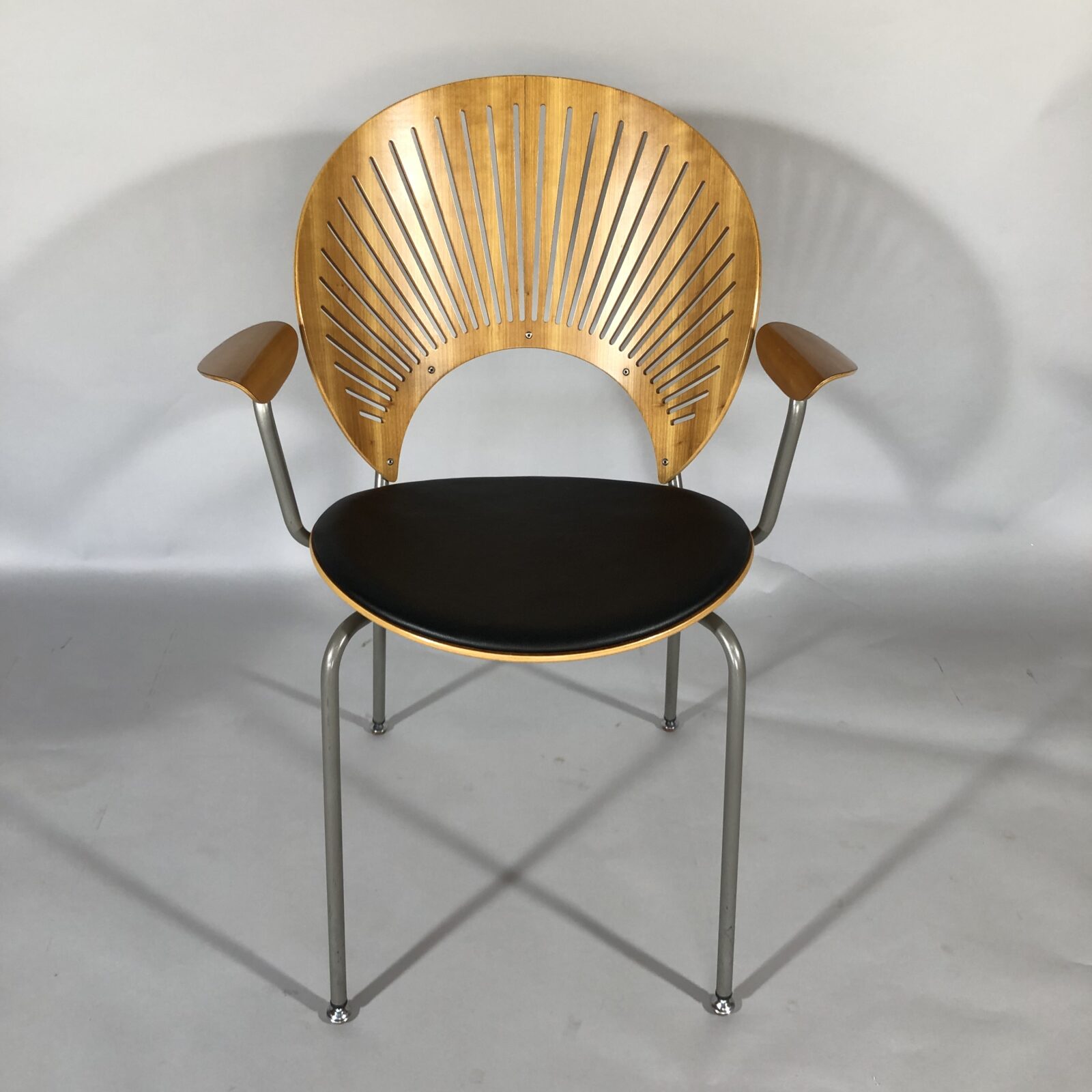 When designing the Trinidad chair in 1993, Nanna Ditzel found inspiration in trhe elaborate fretwork from fascades that she had seen in the Caribbean colonial architecture of Trinidad. Much like the fascades, the cut-out fretwork of the chair triggers an interplay of light and shadows, creating a pattern projected into space & a subtle sense of motion.